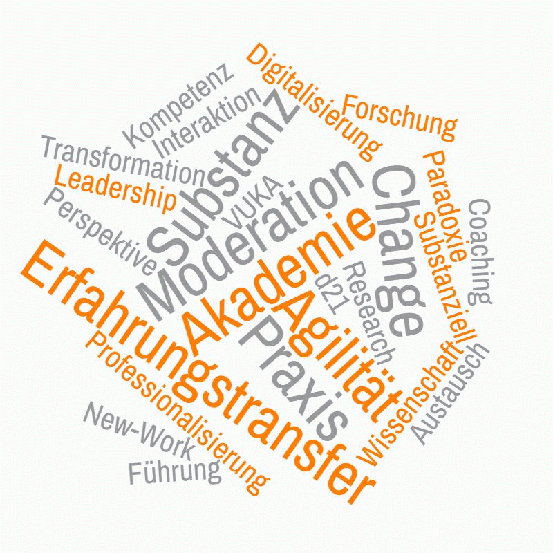 Für die professionelle Weiterentwicklung bietet die d21-Akademie Ihren Kunden Formate und Produkte an, ihre eigene Kompetenz zum State of the Art auszubauen. Dabei verbinden wir fachliche Substanz mit flexibler Pragmatik. Dafür kooperieren wir mit bekannten Universitäten und Fachhochschulen und arbeiten mit Experten zu den Themenbereichen Changemanagement & Leadership sowie Organisationsberatung & Coaching zusammen. Die d21-Akademie wendet sich an Personen dieser Themenbereiche, die sich den hohen Anforderungen in ihrem Business stellen.